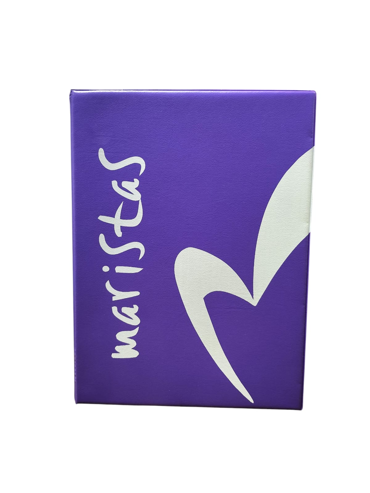3,95€Archivador en color violeta tamaño A5, con 4 anillas, fabricado en plástico (cartón forrado) y personalizado con el corazón, la palabra “maristas” en serigrafía. Tienen lomo de 40 mm.1 disponibles