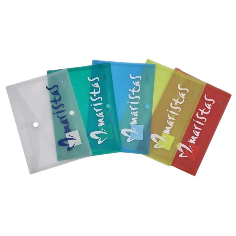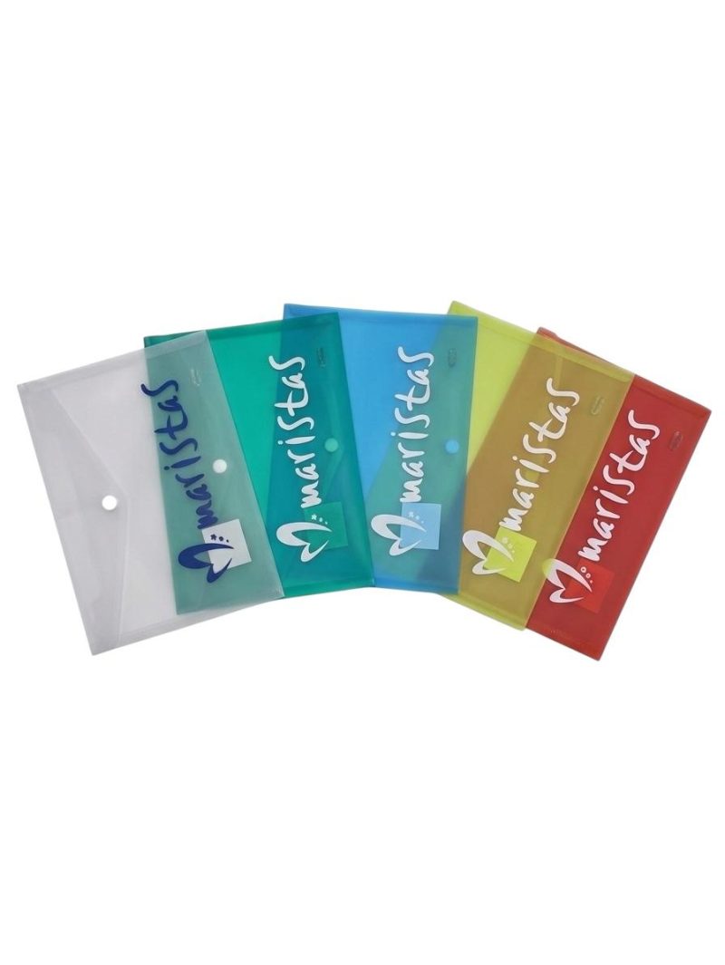2,07€Carpeta tipo sobre portadocumentos de polipropileno translúcido con acabado brillante cristal. Apertura superior y cierre por broche. Personalizado con el logo de Maristas -