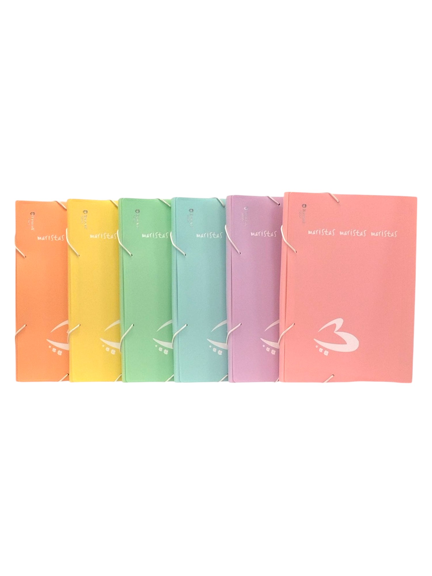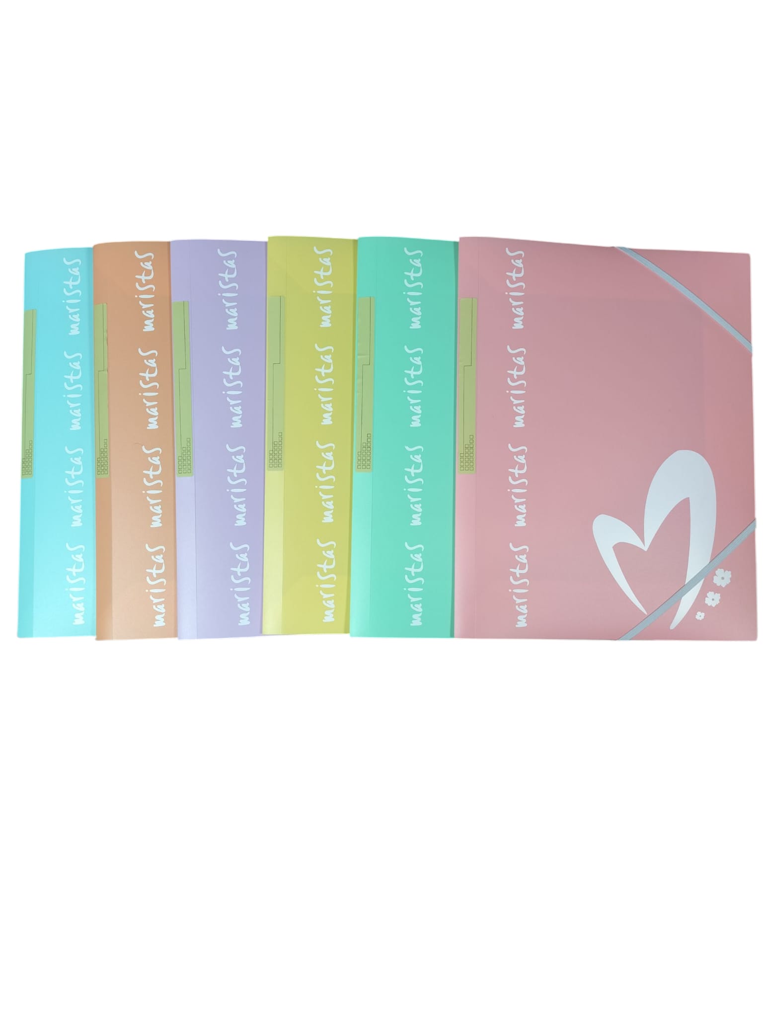 3,10€Carpeta tamaño A4, fabricada en plástico en colores pastel. Tiene gomas y solapas y está personalizada con Maristas. -