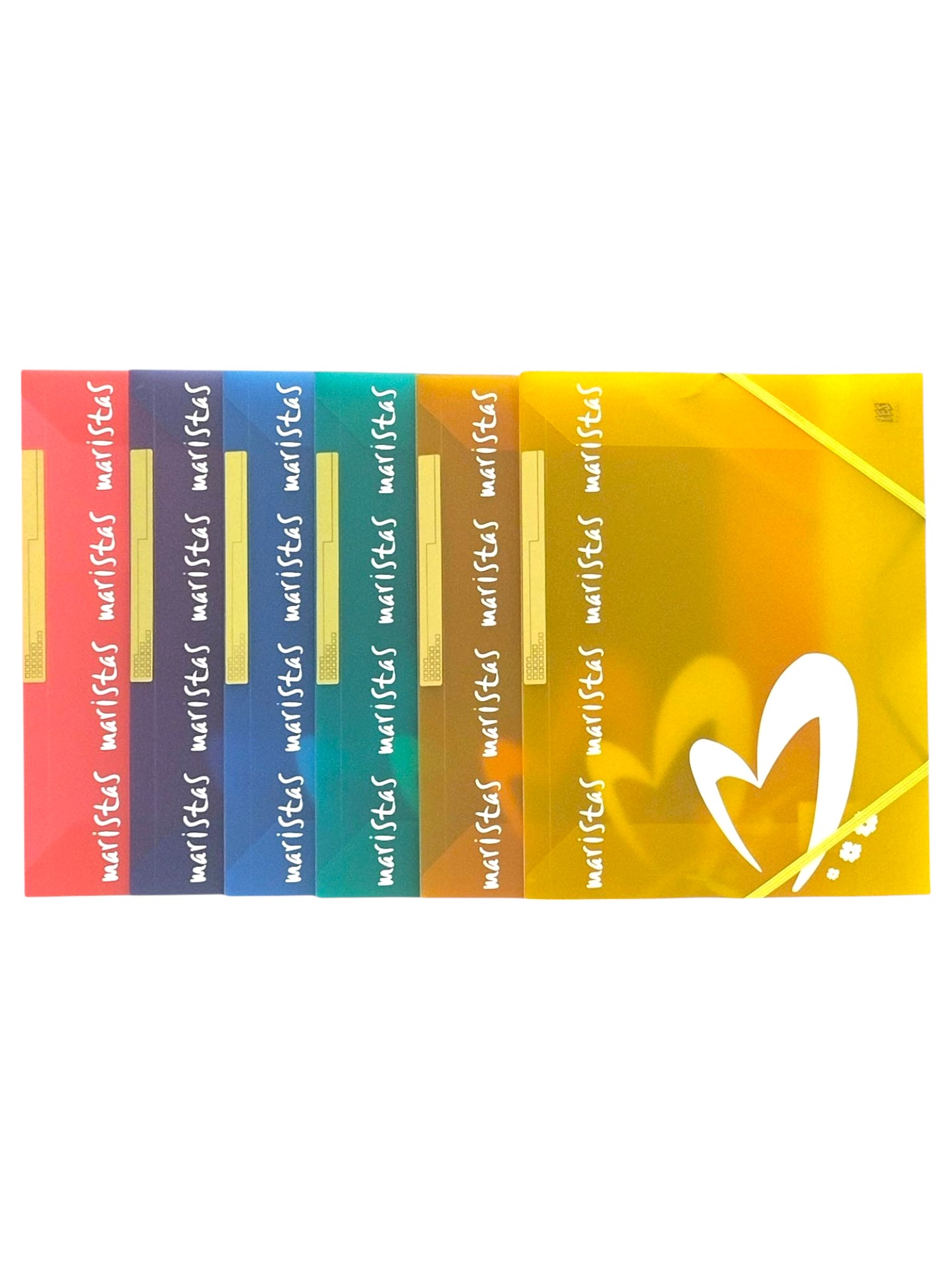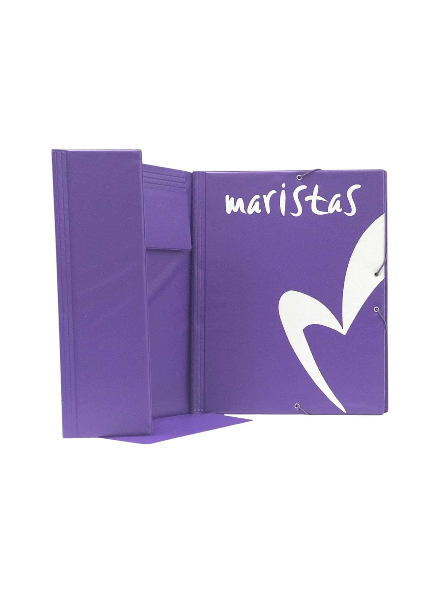 3,10€Carpeta tamaño A4 fabricada en plástico polipropileno traslucido, con 3 solapas y gomas planas. Está personalizada con el corazón y la palabra “maristas” en serigrafía. Hay colores surtidos. -