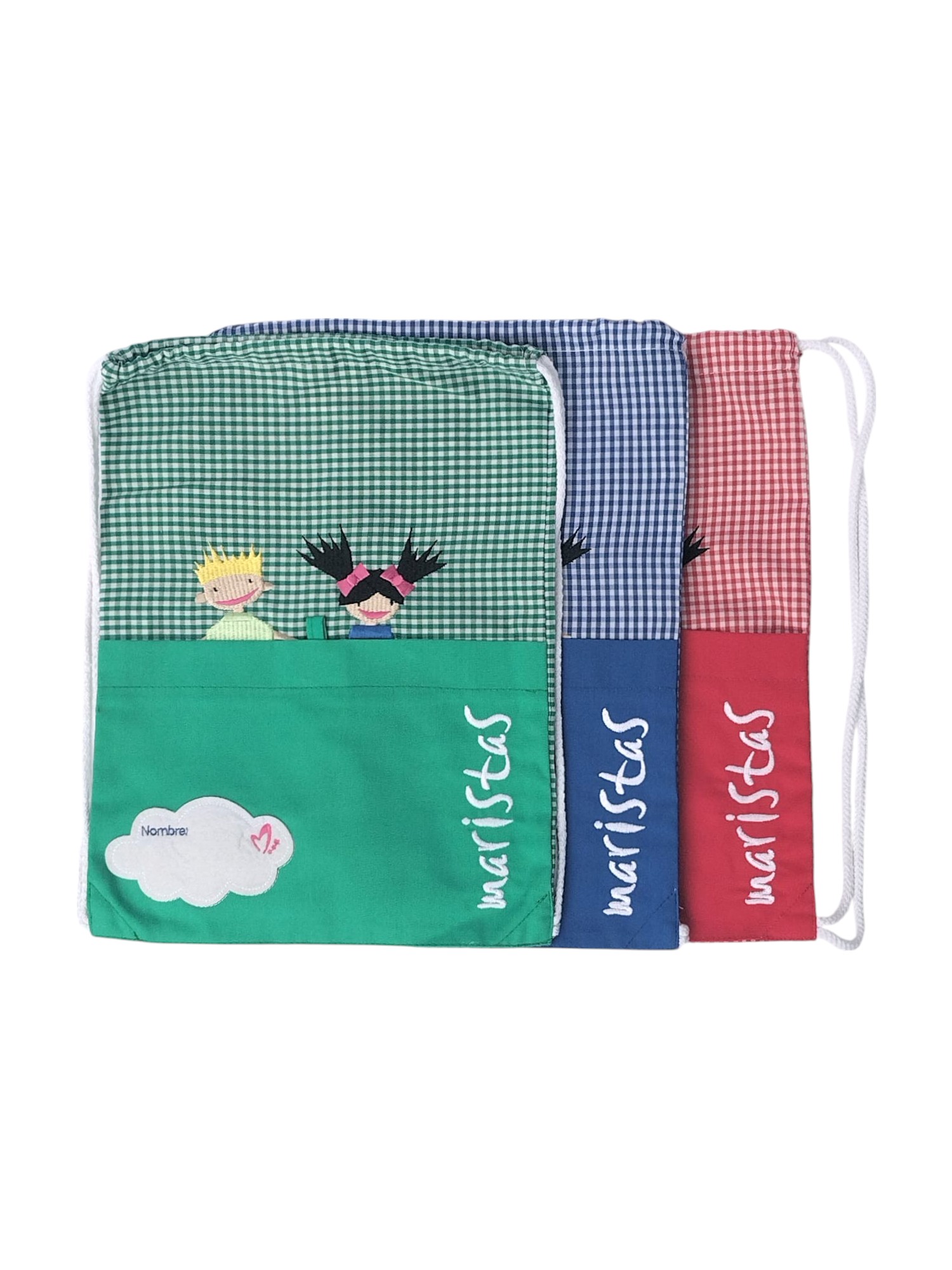 11,98€Bolsa de merienda con el dibujo de unos niños y la palabra “maristas” bordados. Incluye una etiqueta para bordar o escribir el nombre. Fabricada en tela de cuadros, tiene asas para llevar tipo mochila. Disponible en colores azul, rojo y verde. -