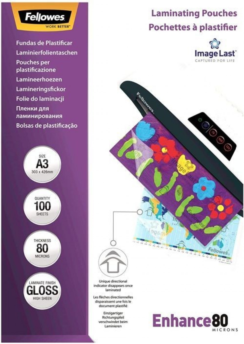 PACK 100 FUNDAS PLASTIFICAR A3 80 MICRAS BRILLO FELLOWES